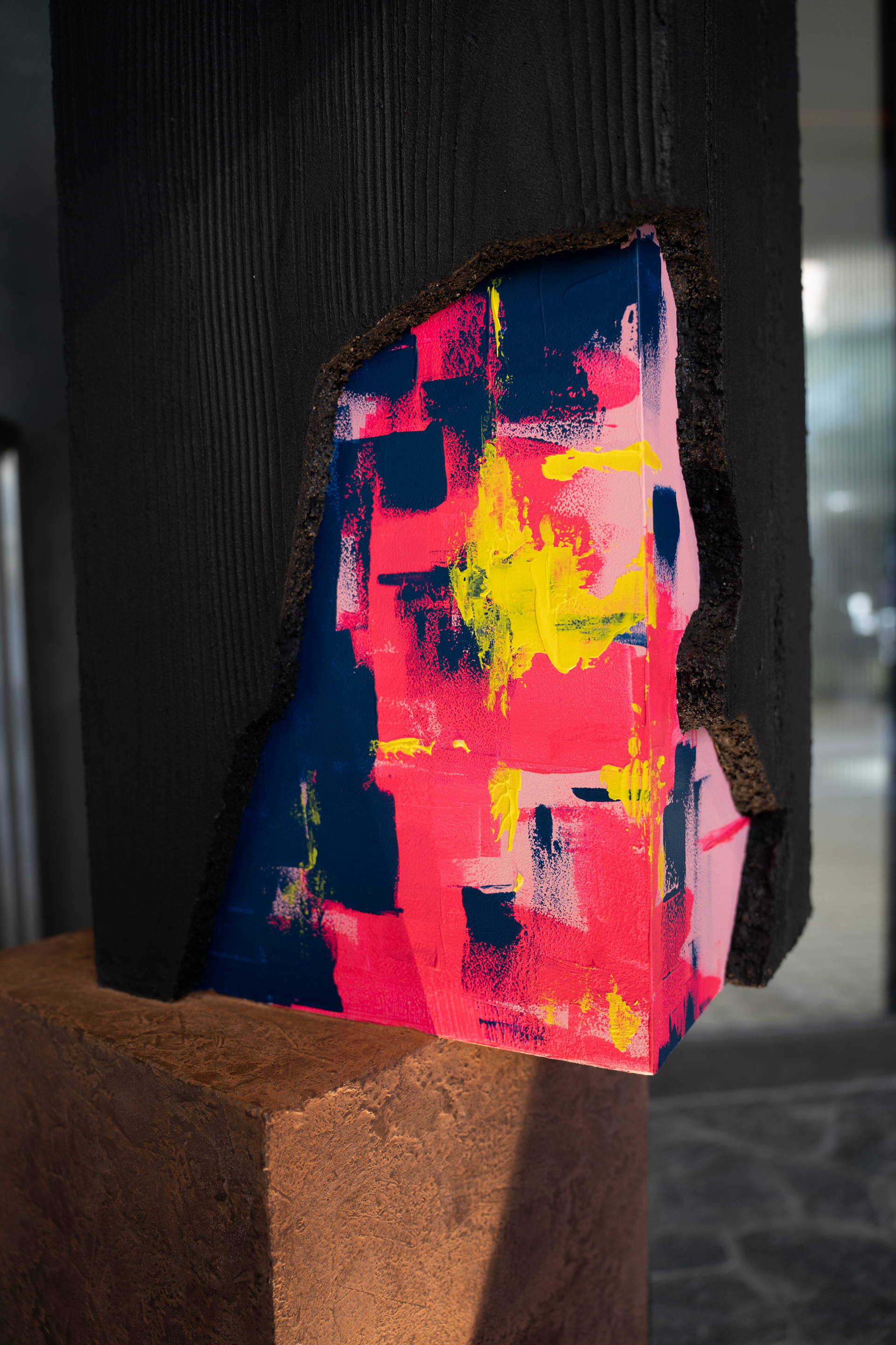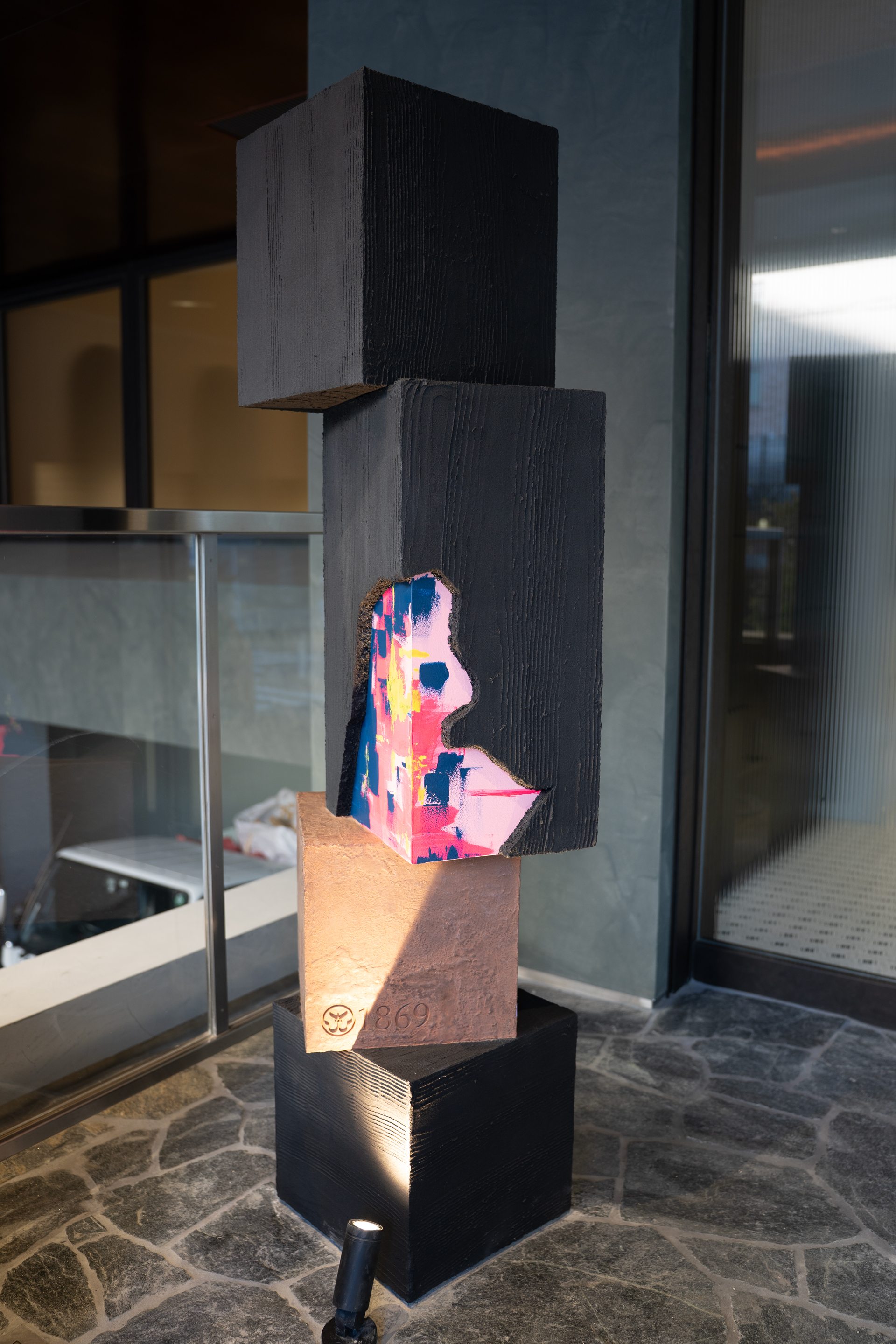 BLOCKS YAMASHITA PARKのファサードに、エントランスを象徴するオブジェを制作しました。この建物は、既存ビルを活かしながら、スタートアップや新しい働き方を支える場へと再生されたプロジェクトです。私たちはその空間コンセプトである NEW CLASSIC を、外部から最初に触れる小さな立体として表現しました。黒いブロック状の構成は、施設名である “BLOCKS” の名に呼応しながら、建築の量感や石材の重なりを受け継ぐもの。そこに、手描きによる鮮やかな色面を重ねることで、歴史ある港町・横浜の時間と、ここから生まれる新しい活動のエネルギーを重ね合わせています。オブジェの一部には、記号や象形文字のような抽象性を持たせ、過去から受け継がれる痕跡と、未来へ向かう創造性が同居する存在を目指しました。サインでも、単なる装飾でもなく、訪れる人の視線を受け止め、この場所の物語へと導くためのファサードオブジェです。