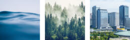 波や山々、ビル群をモチーフにした抽象的なペイントタッチによって、海・山・街といった異なる要素が連なり、共存していく様を描いています。