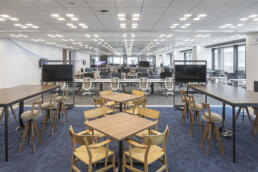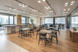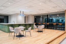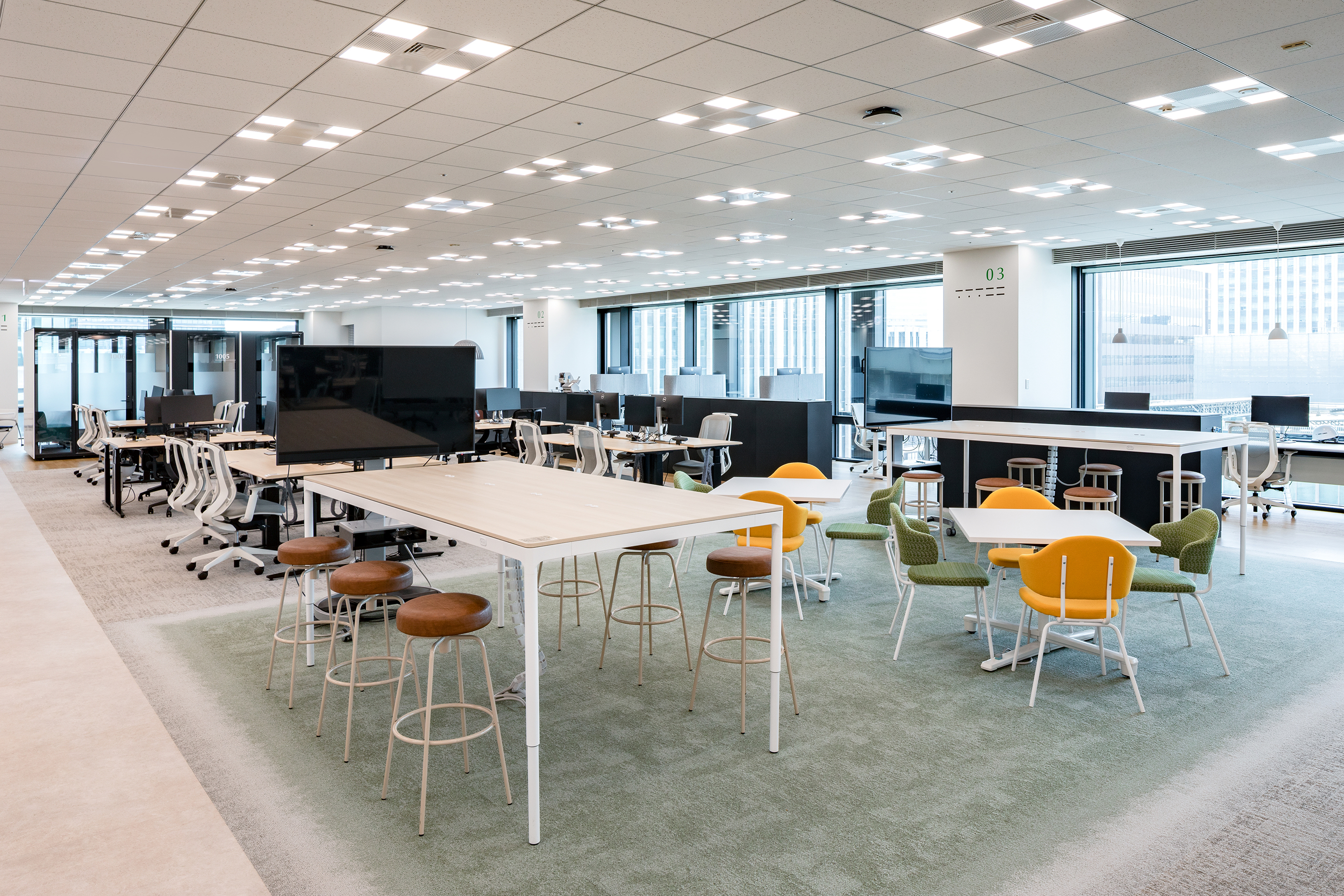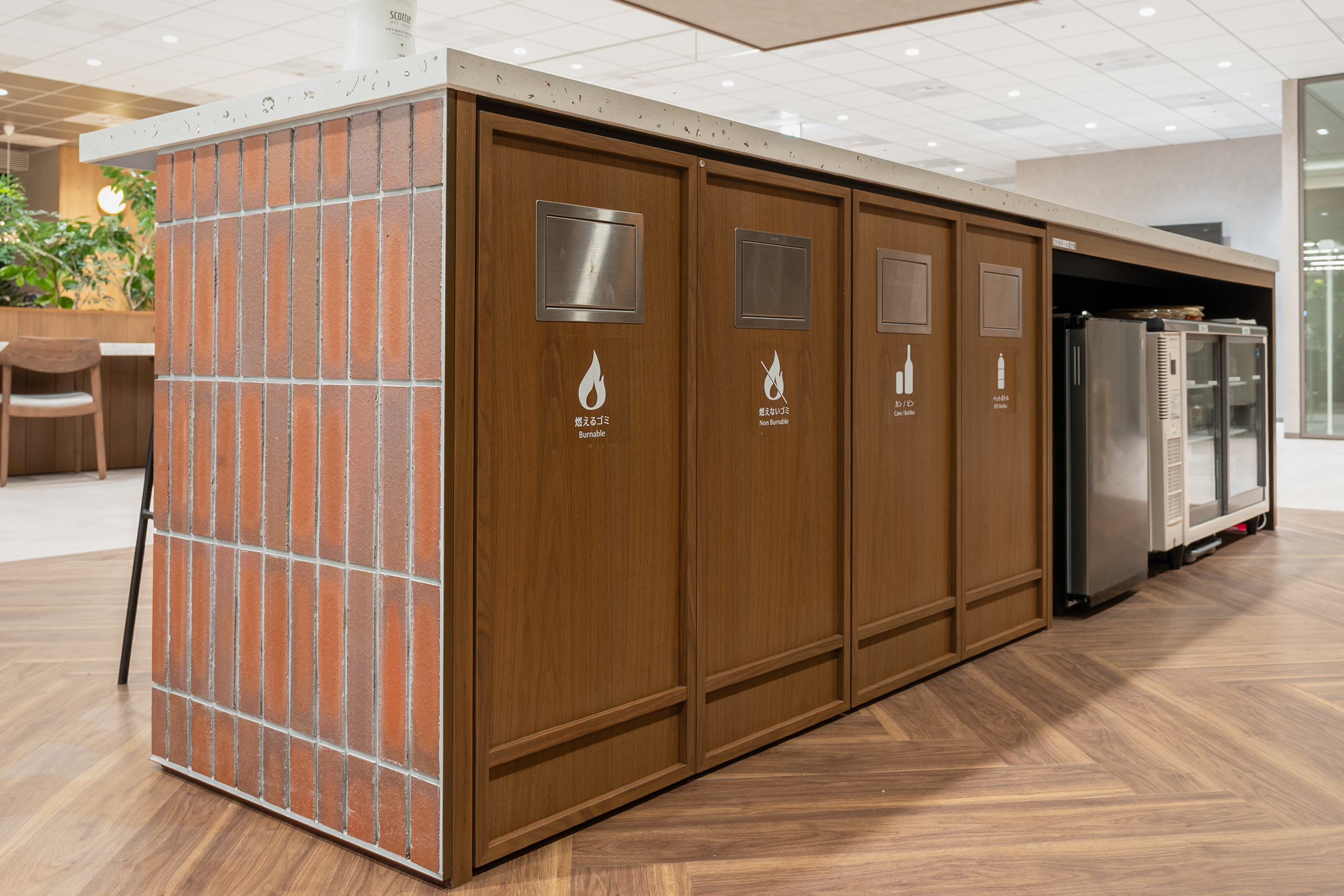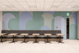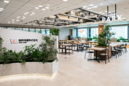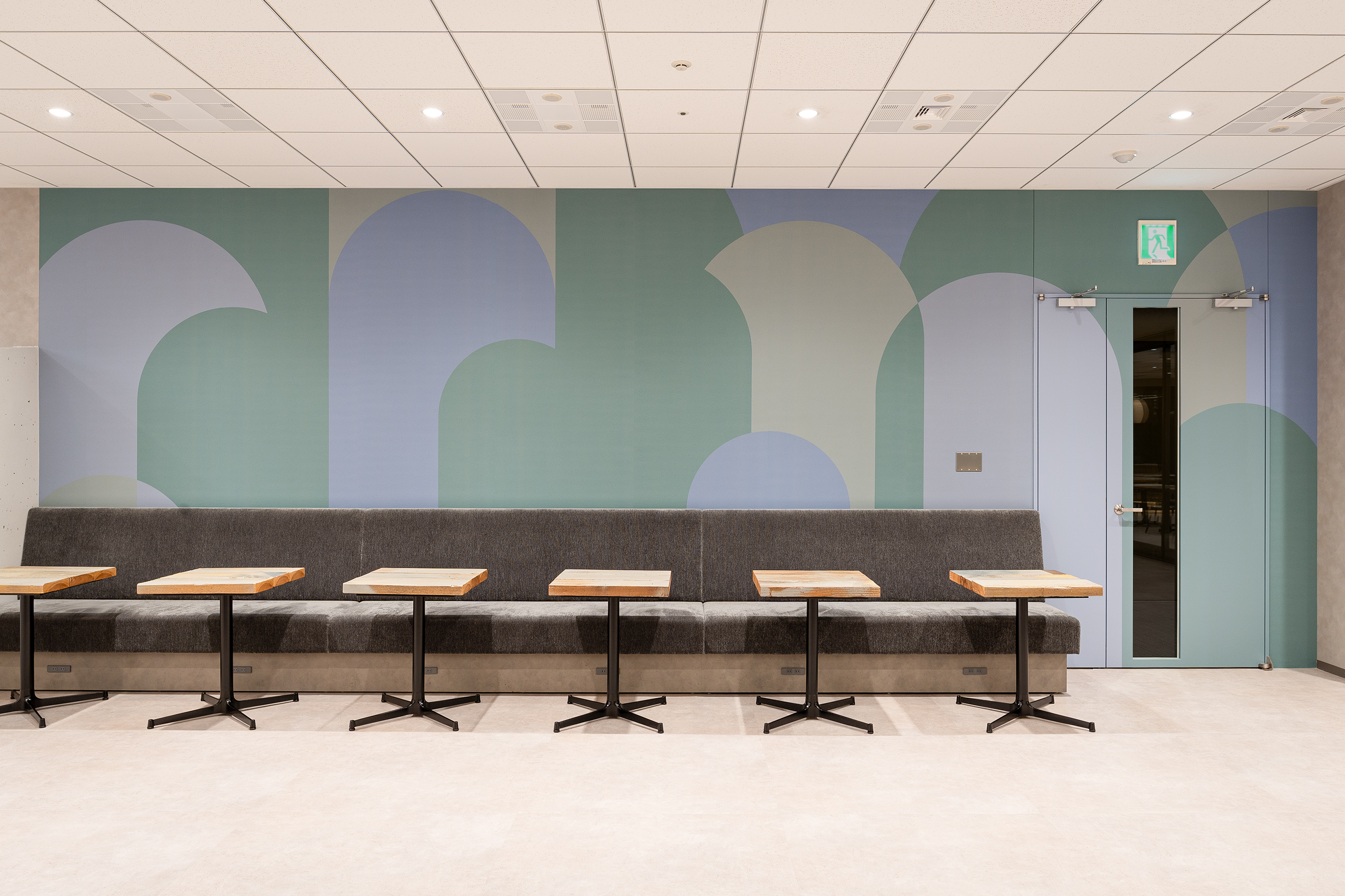 社内外の人々が出会う接点となるコワーキングラウンジの壁面グラフィックには、企業と社会、そして環境との関わりを抽象的に表現。