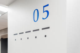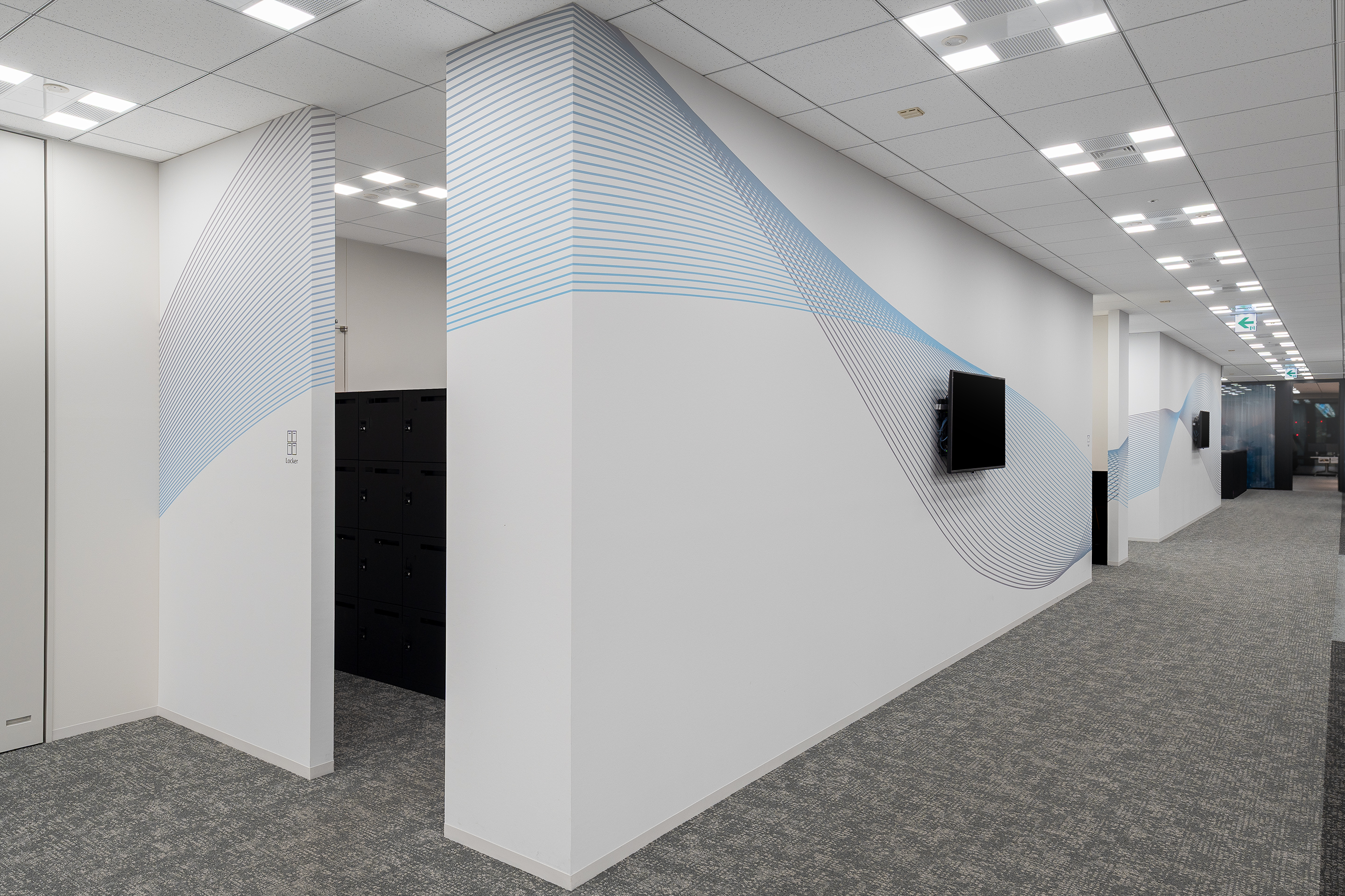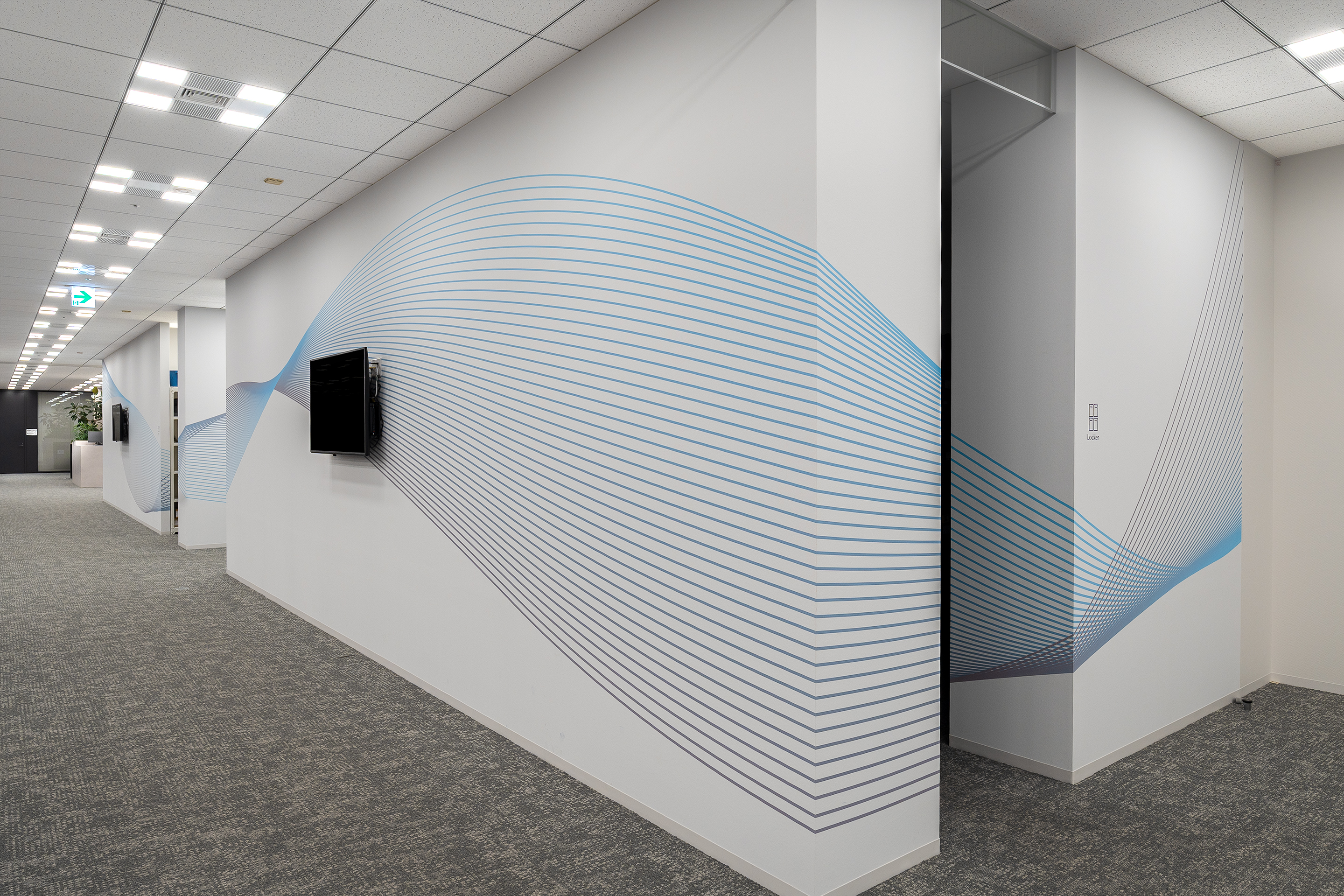 飯野海運株式会社のオフィスリニューアルにおいて、壁面グラフィックおよびサインデザインを担当しました。オフィス全体のコンセプトである「Next Wavesを生み出すオフィス」を軸に、海運事業・不動産事業といった異なる事業が交差し、ともに遂行される場としての在り方を視覚的に表現しています。また、人と人との出会いや交流を促し、コミュニケーションの活性化を通じて新たな価値やアイデア=“NEW WAVES”を生み出す助けとなるサイン・グラフィックを目指しました。