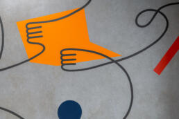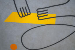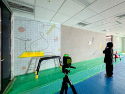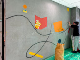 クラウドサービスを展開するIT企業の増床フロアにて、壁面アートを制作いたしました。 本作では、同社のプロダクトによって業務効率が向上し、前向きな変化を遂げたお客様の姿をモチーフに、企業と顧客の間に生まれる新たな価値とつながりを表現しています。 すべてのグラフィックは、手作業によるハンドペイントで丁寧に仕上げています。
