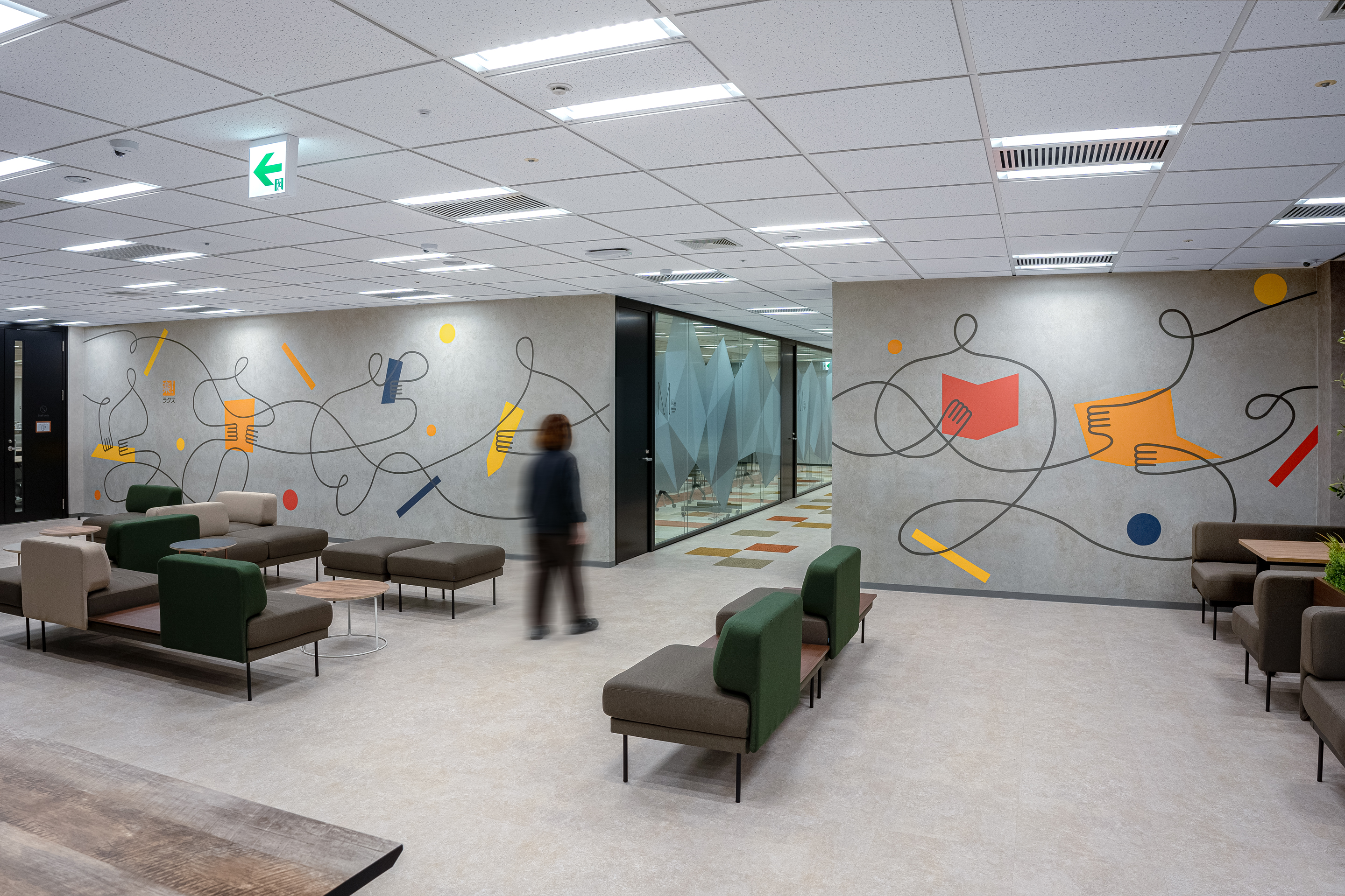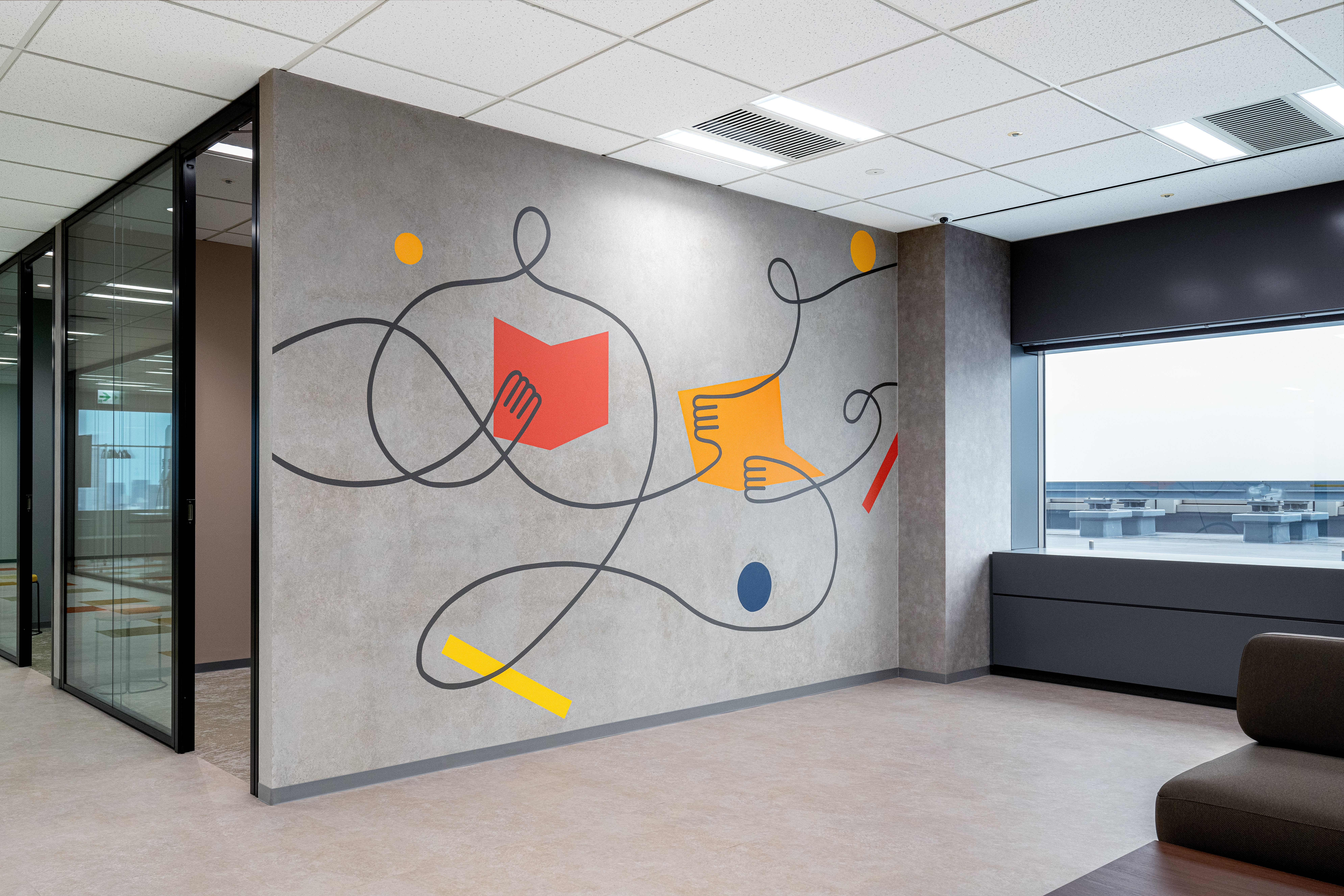 クラウドサービスを展開するIT企業の増床フロアにて、壁面アートを制作いたしました。 本作では、同社のプロダクトによって業務効率が向上し、前向きな変化を遂げたお客様の姿をモチーフに、企業と顧客の間に生まれる新たな価値とつながりを表現しています。 すべてのグラフィックは、手作業によるハンドペイントで丁寧に仕上げています。