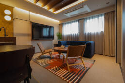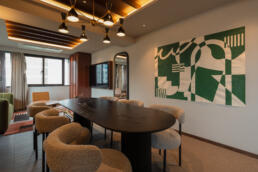 京都の碁盤の目に象徴される秩序ある都市構造と、枯山水に見られる余白と静けさの美しさを手がかりに制作されたアートワークです。都市と庭園、人工と自然、静と動。相反する要素のバランスを、マテリアルと構成によって表現しています。直線的な構成や区画の重なりは街の構造を想起させ、素材の凹凸や陰影は、見る位置や時間によって表情を変える静かな動きを生み出します。重ね、編み、空間の中で静かにつないでいくことで、滞在の記憶にそっと残る、京都らしい奥行きとリズムを添えることを意図しています。