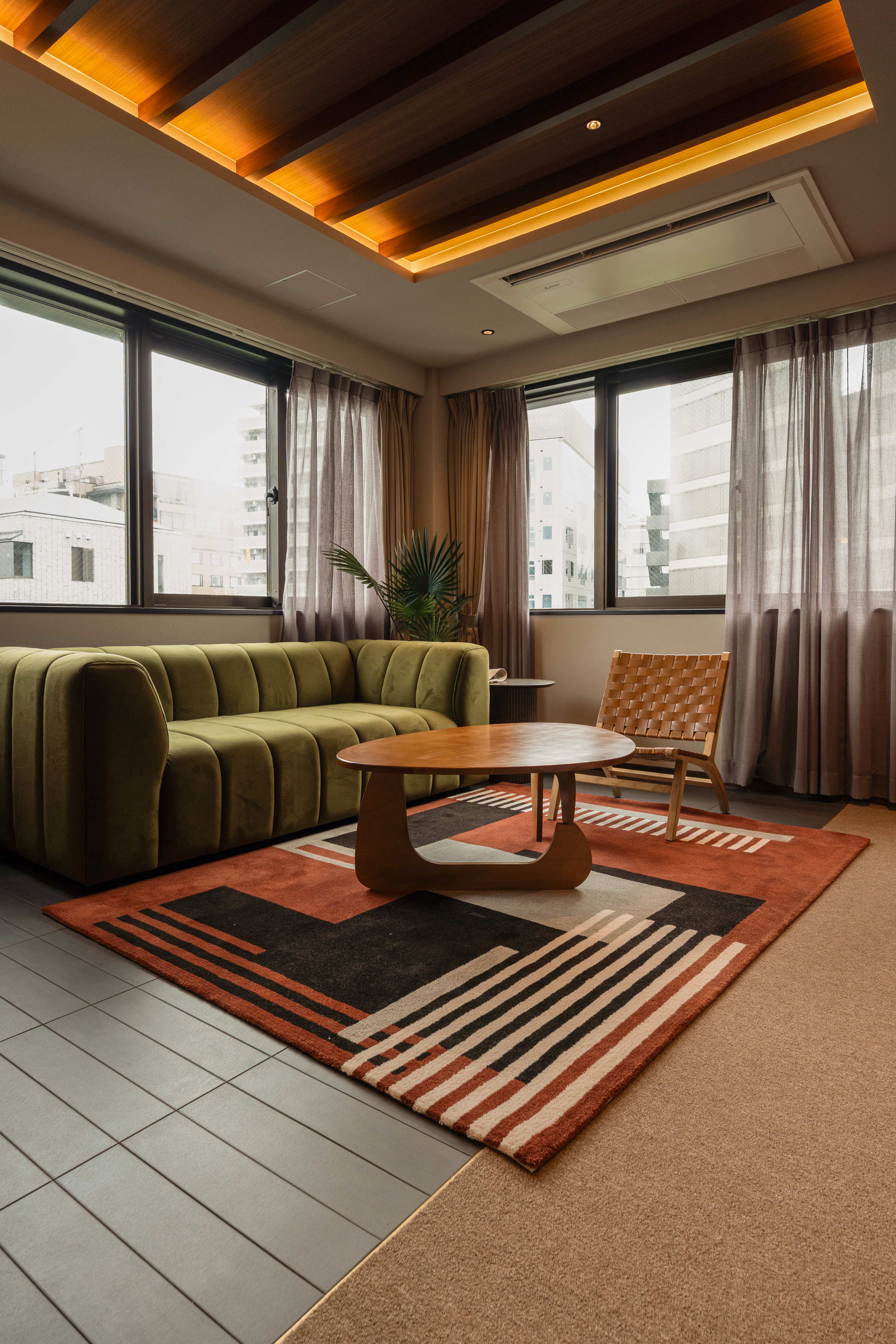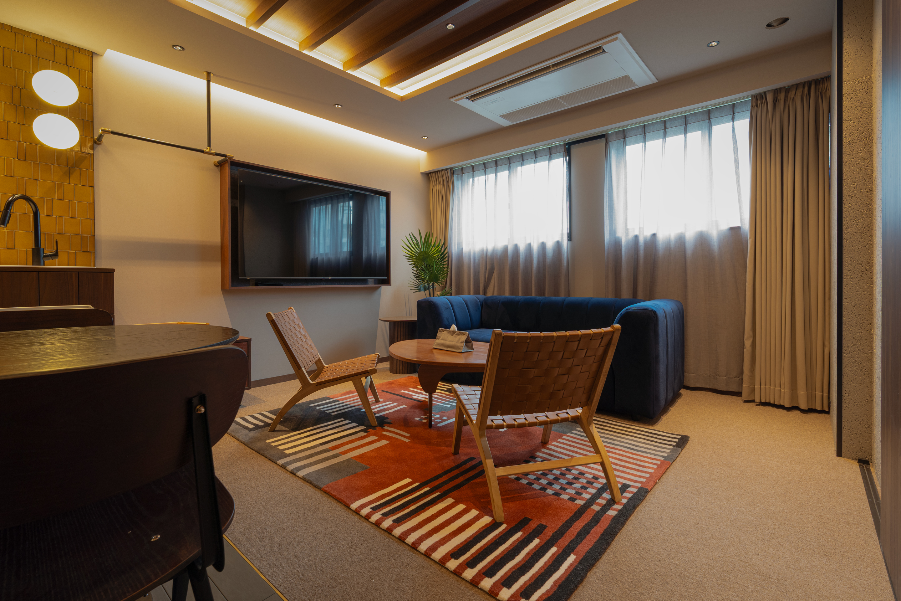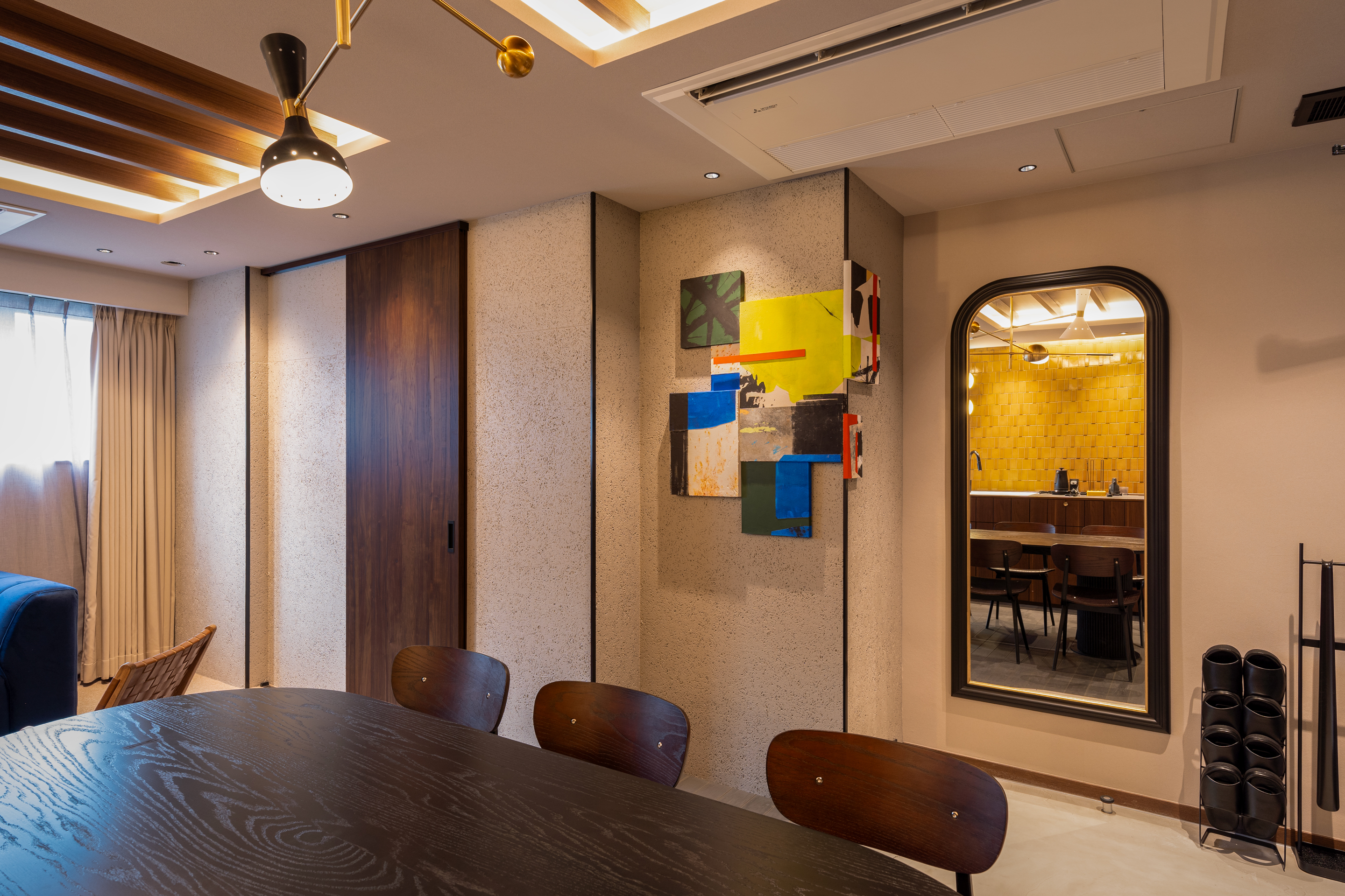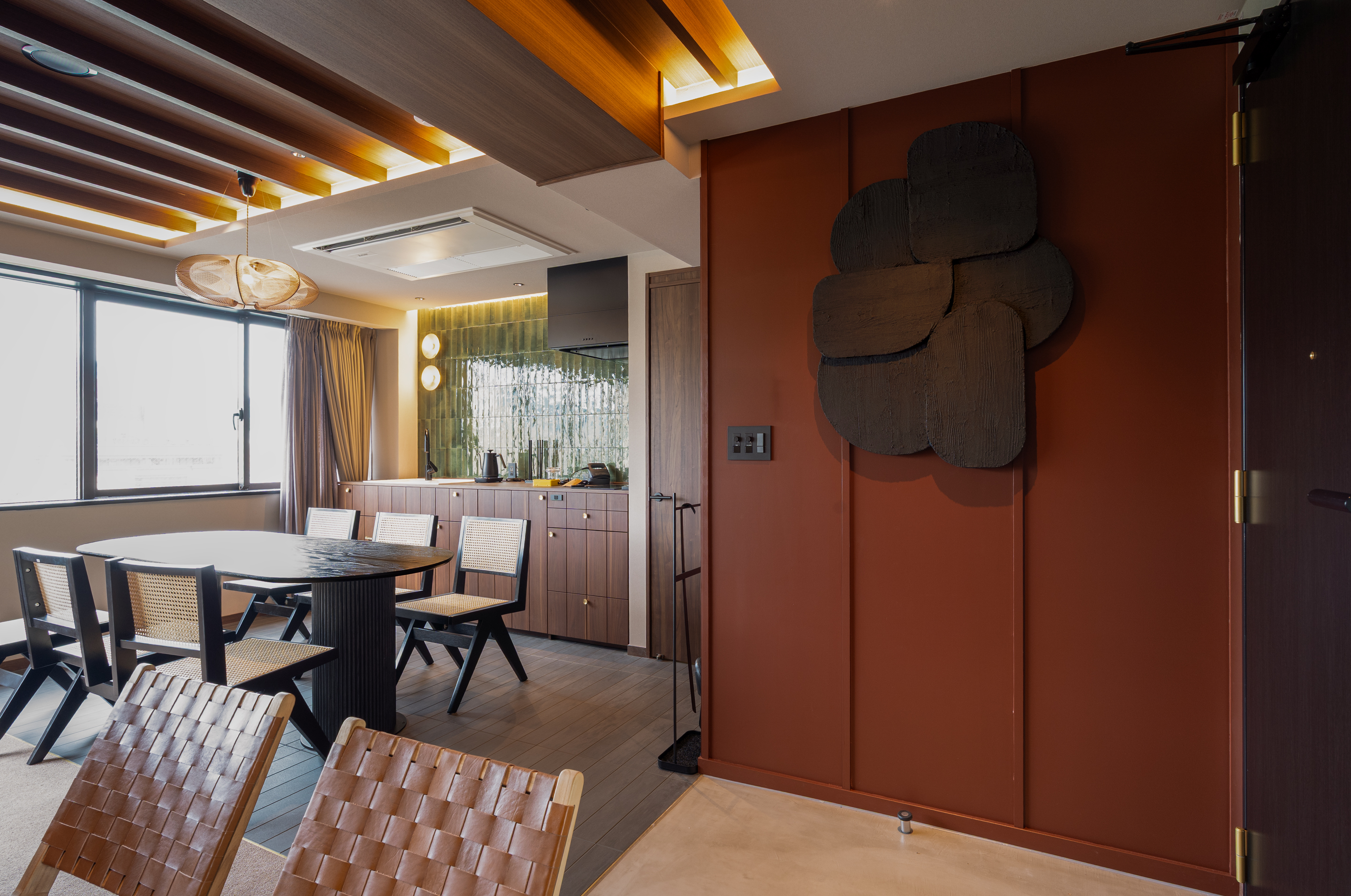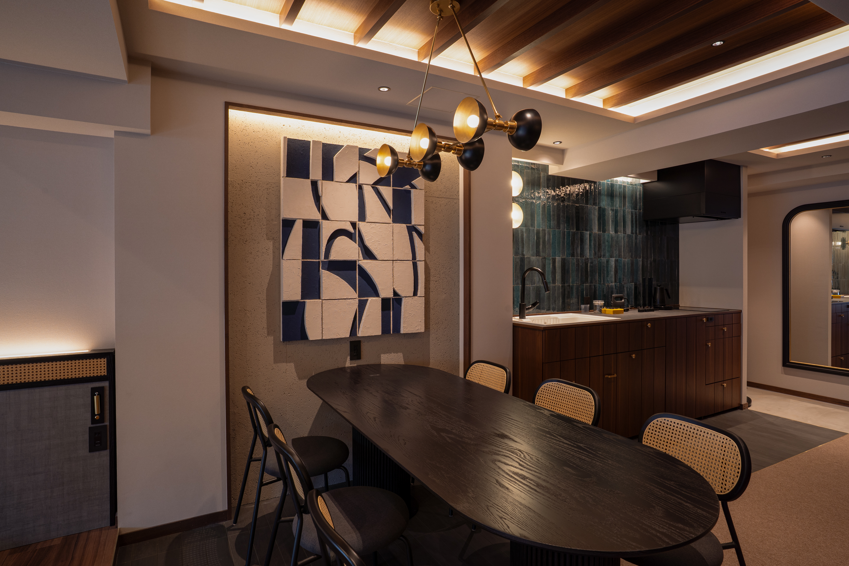 京都の碁盤の目に象徴される秩序ある都市構造と、枯山水に見られる余白と静けさの美しさを手がかりに制作されたアートワークです。都市と庭園、人工と自然、静と動。相反する要素のバランスを、マテリアルと構成によって表現しています。直線的な構成や区画の重なりは街の構造を想起させ、素材の凹凸や陰影は、見る位置や時間によって表情を変える静かな動きを生み出します。重ね、編み、空間の中で静かにつないでいくことで、滞在の記憶にそっと残る、京都らしい奥行きとリズムを添えることを意図しています。